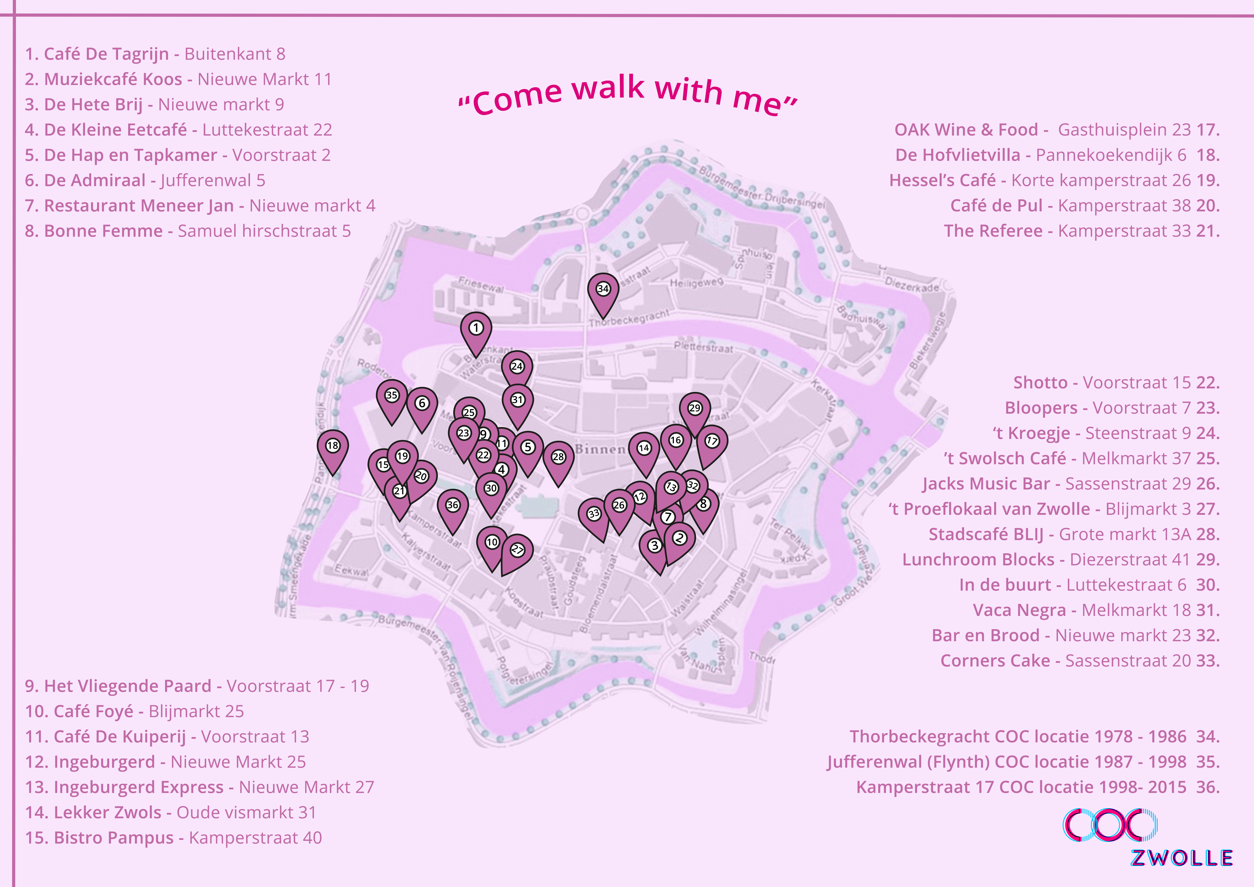 Je mag zelf je eigen route samenstellen langs horecagelegenheden in Zwolle en voormalige locaties van COC Zwolle volgens bijgaand overzicht. Je kunt starten waar je wilt en ook een deel van de route lopen.
