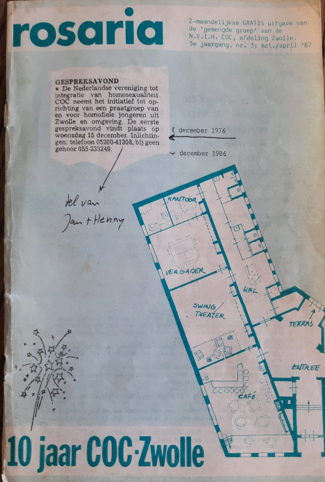 In 1976 is het allemaal begonnen. Marinus, COC-er in Zwolle, had het idee opgevat een praatgroep voor homoseksuelen op te starten. Hij stapte naar de COC-werkgroep in Deventer, waar het initiatief met groot enthousiasme werd begroet. De Deventer groep bracht Marinus in kontakt met Zwols COC-er Jan. Jan bracht Marinus in kontakt met Henny en zo werd COC-Zwolle geboren. De werkgroep in Deventer kende Jan van aktiviteiten op homo-gebied in Zwolle, o.a. door het organiseren van een stand in ’72 (zie hiervoor het artikel van Jan Boonstra, ‘Zwolle vóór het COC’, elders in deze Rosaria).