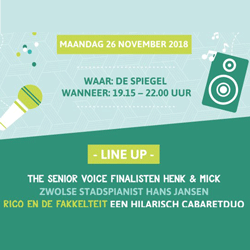 De avond vindt plaats in Theater De Spiegel aan het Spinhuisplein op maandag 26 november. Vanaf 19.15 uur staat er een kopje koffie, thee en wat lekkers voor je klaar. Om 20.00 uur gaan de deuren van de zaal dicht, dus zorg dat je op tijd aanwezig bent. We sluiten de avond af met een kleine borrel rond 22.00 uur